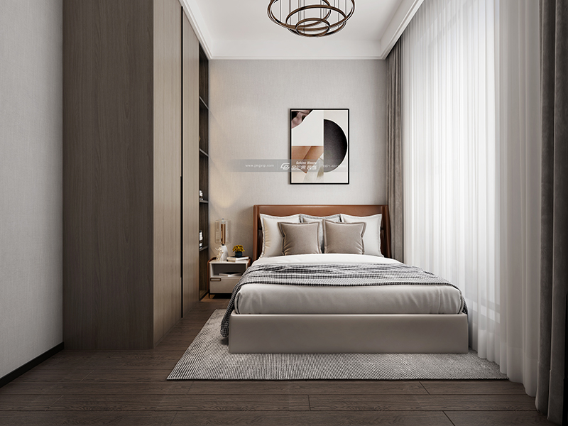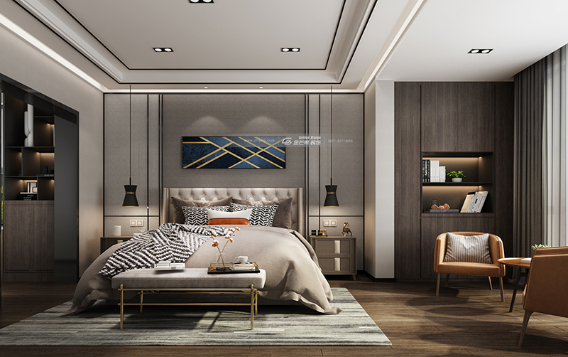 半圓弧的背景墻讓空間更有包裹感,衣柜被設(shè)置于房間入口處,L形衣柜讓空間形成獨立玄關(guān),增加空間私密性。色彩上用中色調(diào)搭配黑鏡,溫潤的棉麻墻布,給屋主更溫柔的呵護。黑藍金抽象畫點綴棗 ,富有藝術(shù)氣息同時也打造時尚感。
