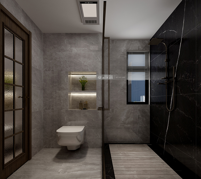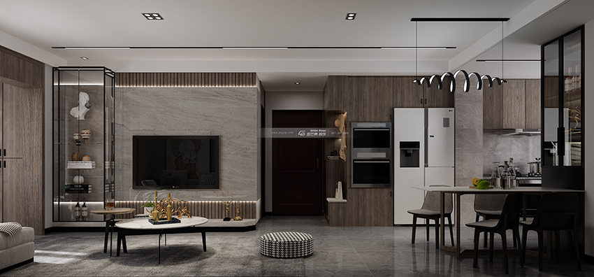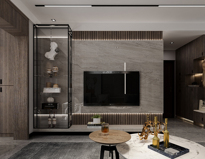 灰色的格調(diào)更顯氣質(zhì)和沉淀感,加上一些木飾面的處理,帶來(lái)滿(mǎn)滿(mǎn)的安全感和品質(zhì)感。灰色的地磚和大理石上墻,經(jīng)典耐看。電視柜旁的玻璃柜體很有設(shè)計(jì)感,且通透感很好,輕快、精致、時(shí)尚的感覺(jué)。