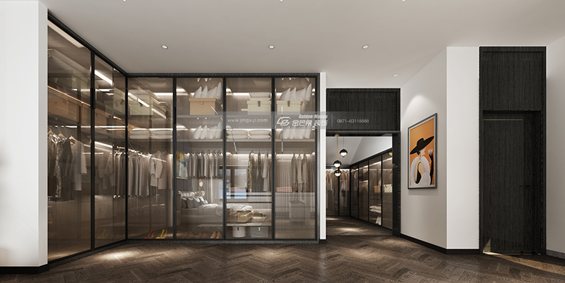 通過灰色木質墻板,藝術涂料,大理石材質使整個空間充滿現代極簡藝術的氣質,細節上質感十足。燈光上運用大量的線性光,點光源,即營造出空間的氛圍感,同時也增加了畫面構成的設計感。