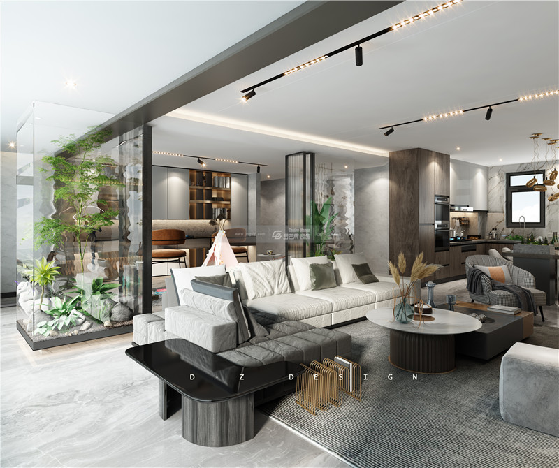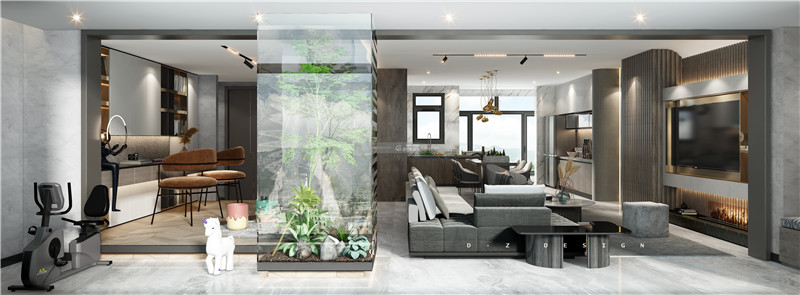 采用在房間內創造花園景觀的一種方式,將綠植作為最大的裝飾元素,和灰色的空間格調相結合,仿佛置身于林中,喚醒自然的氣息。