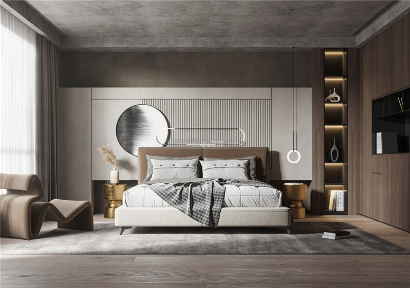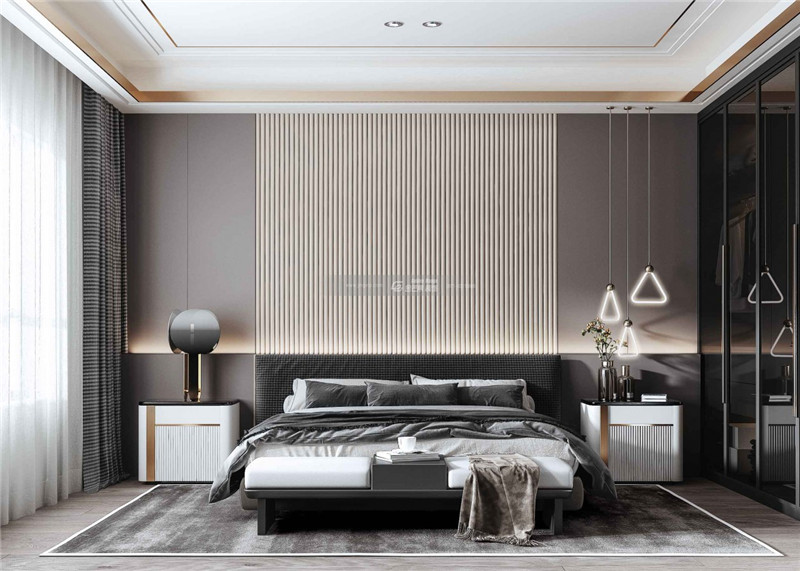 用精致的燈飾和簡約金屬材質點綴其間,對比之間碰撞出個性氣質的藝術家居氛圍。沉靜的顏色適合舒睡。