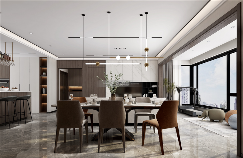 氣質清麗、婉約,讓空間變得細膩而溫柔,精致的燈飾讓空間充滿時尚感。餐桌椅簡約而有品質,高級中又帶有精致、婉約的氣質。餐邊柜也為空間注入了大氣、雅逸的氣質。