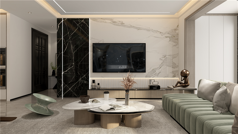大理石電視背景墻,一黑一白兩色讓視覺有了重心,加上淺綠色的搭配,清新優雅的氛圍打造沉靜的氣質空間。
