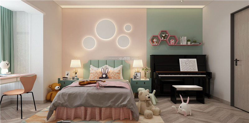 粉嫩的顏色是兒童房的寵兒,粉色、綠色拼色處理,描繪絢麗的童年,活潑的造型,有趣的卡通裝飾,都在互相講述一個(gè)童話里的故事。