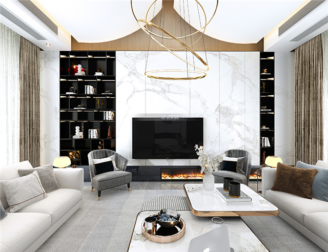 黑白灰的高級搭配,大理石電視背景墻和黑色輕奢的柜體,打造層次感。壁爐的加入,更增添了一些溫暖優(yōu)雅的氣息。灰色沙發(fā)和地毯,經(jīng)典耐看,高級感呈現(xiàn)。