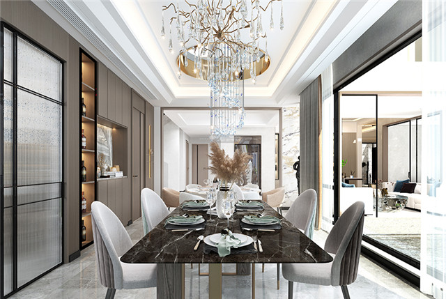 垂墜的燈飾傳達(dá)華麗的家居態(tài)度,讓整個家居氛圍呈現(xiàn)雍容華貴的氣息,大理石加金屬線條的餐桌臺面,精致的餐具,在光影交錯間,一切都變得充滿儀式感。