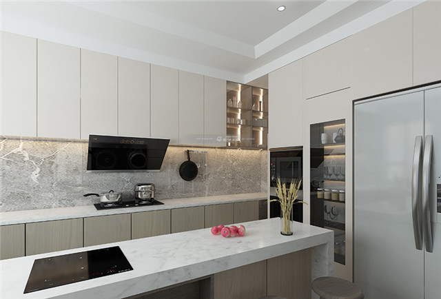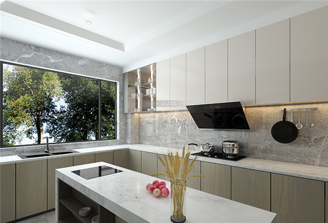 大大的窗子,明亮的氛圍,食物仿佛也有了更加鮮明的顏色。中間設(shè)置島臺,同時滿足中西廚烹飪需求,明亮、時尚的空間氛圍。