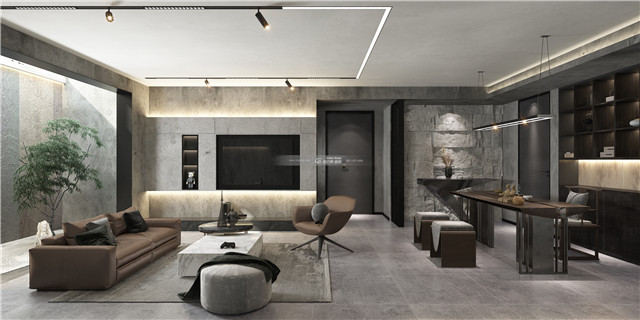 工業loft風,滿足屋主個性化需求和審美感受。整體灰色墻體搭配棕色家具,高級冷酷的感覺讓家居充滿個性,營造安穩、沉靜的感覺。