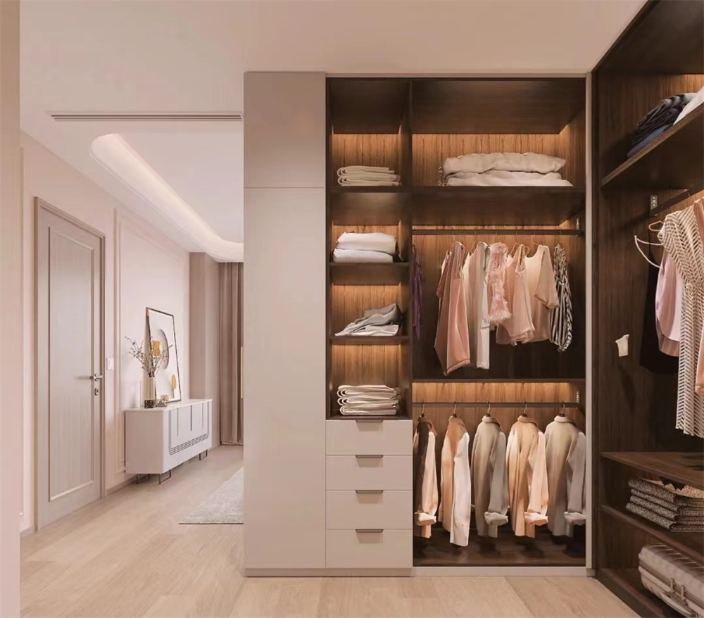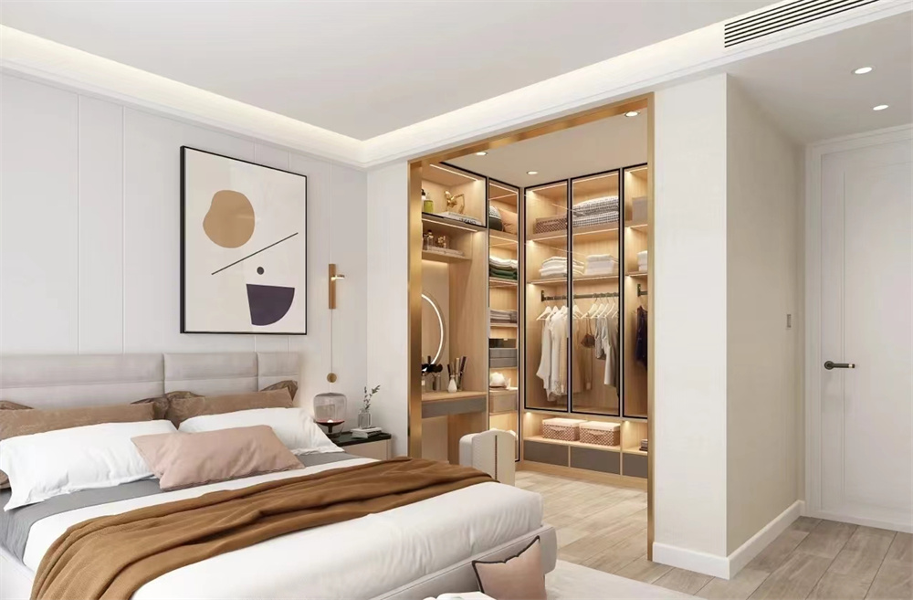 若是遇到一些特殊的戶型,也不必?fù)?dān)心,幸福金芒果裝飾在這溫馨建議您,一定要利用好這段動(dòng)線,可以在走廊兩側(cè)定制通頂式的衣柜,這樣每次步入房間,都會(huì)經(jīng)過自己魅力精致的衣帽間啦,而且左右兩側(cè)空間也變得更豐富,可以容納更多的衣物!
